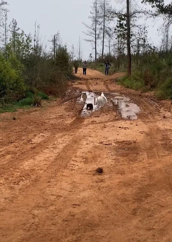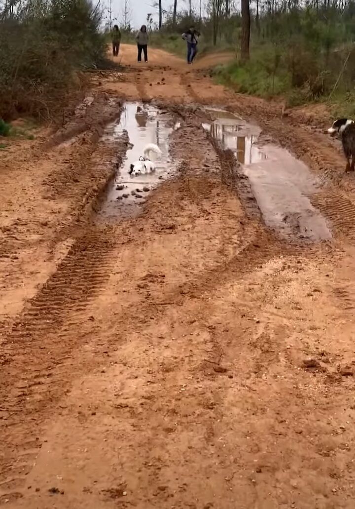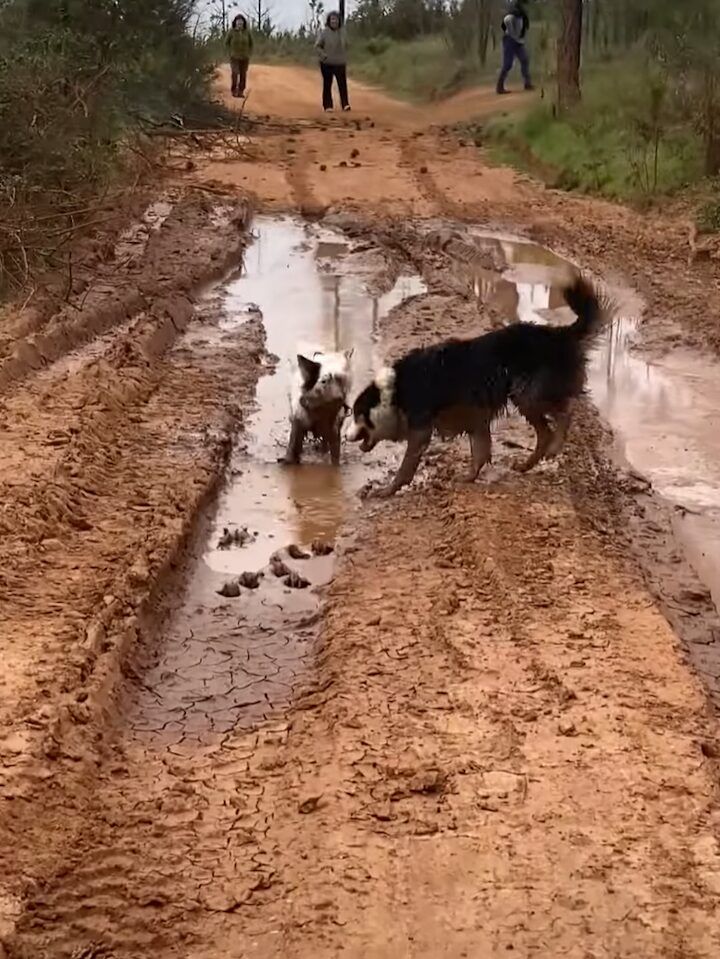 2. 泥遊びを満喫する犬たち。道路にできた水たまりに向かって一直線!!【海外・動画】