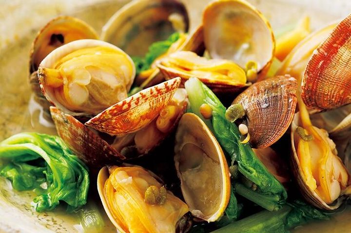 程よく辛味が効いた“アサリと山東菜の酒蒸し”