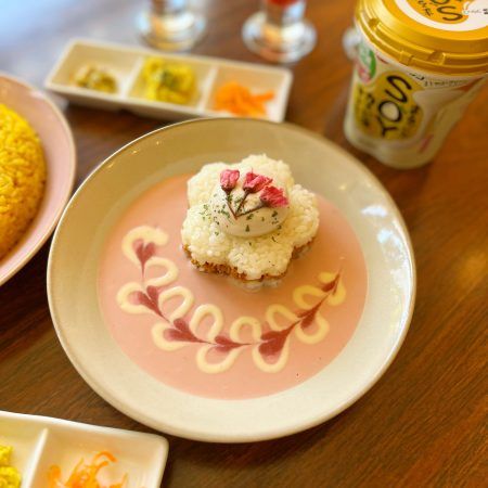 こちらは、全体的にほんのりピンク色!サクラをかたどったライスの上には、水切りした「まるごとSOYカスピ海ヨーグルト」がのっています。 こちらのヨーグルト、水切りするとまるでチーズみたいな食感と風味になるので不思議!