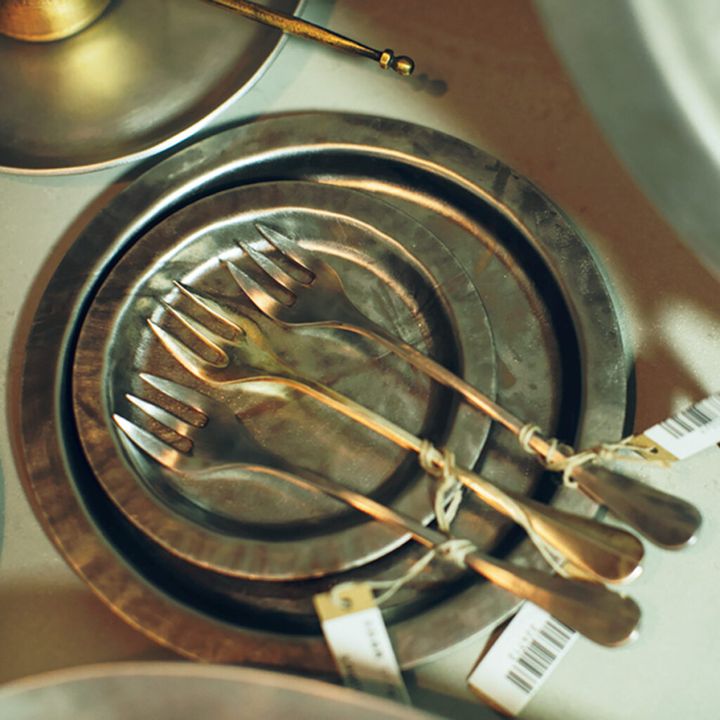 こちらのお皿はステンレス製。アルミと似ていますが丈夫で錆びにくいのが魅力。お皿もカトラリーも永島義教さんの作品。牡蠣を食べるオイスターフォークから発想したというミニフォークは¥5,940。