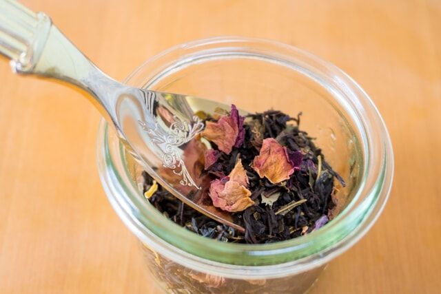 ▲マリーゴールドやバラの花弁も入った茶葉も華やか