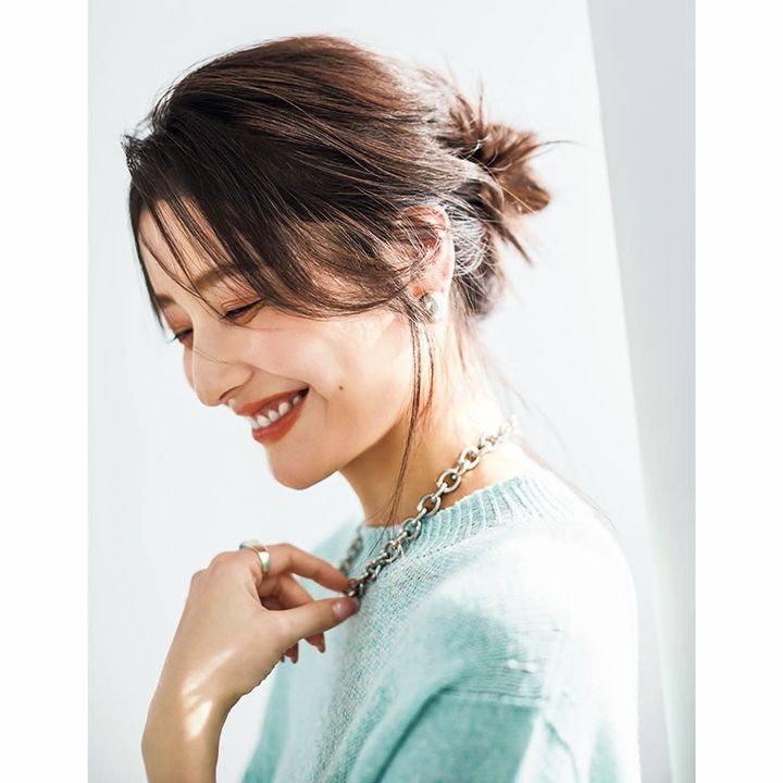 ニット¥17,600(カリテ/カリテ スケープ コレド日本橋店)イヤリング¥7,560(アビステ)ネックレス¥9,900〈エイチアッシュ〉リング¥22,000〈オンブル ビジュー〉(ともにフォーティーン ショールーム)