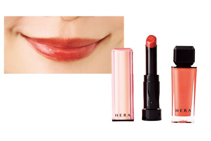 HERAのリップは色持ちが優秀。馴染みがいい左のバームで輪郭を意識して塗り、右のグロスを中央から広げツヤをプラス。重ねることで長時間話しても落ちにくく。