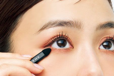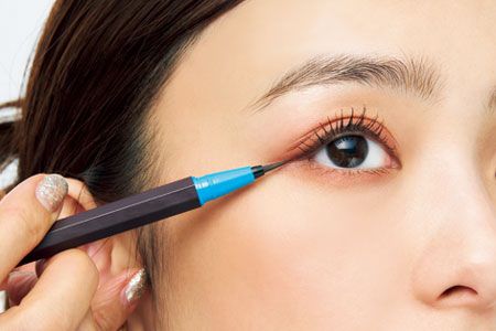 Fのアイライナーでまつ毛の間を埋め、目尻は5mmほどスッと真横に伸ばす。目尻の三角ゾーンを埋めて目尻は太めでOK。