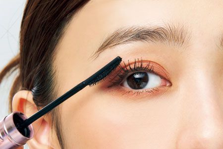 Eのマスカラをまつ毛の根元から上に立ち上げるように放射状に塗り、しっかりセパレートして存在感を出す。