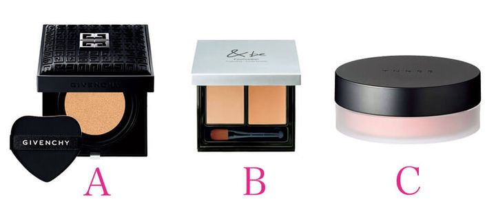 内側から外側に向けて薄く全体にAを塗り、トーンアップ。目の下のクマやほうれい線など影になる部分をBでカバーし、Cをフワッとのせて陶器のような均一な欠点レス肌に。