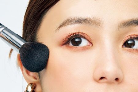盛り耐性あり派は、くっきり陰影を出したメリハリのある立体感メイクが似合う半面、それぞれのパーツがナチュラルすぎると地味に見えてしまいます。肌はメイク感を出しつつ上質に見えるセミマット質感にして、目元とリップにトレンドの赤みピンクを入れます。肌がマット寄りなので目元とリップはツヤっぽく仕上げて。目元とリップで色を入れている分、チークは色を引き算してなじみカラーで陰影を強調するようにフワッとのせます。