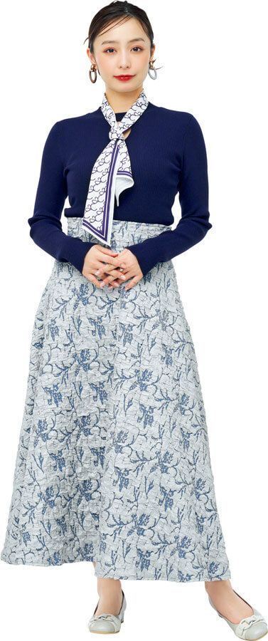 フワッと広がる華やかなジャカードスカートでAラインを作り、引き締めカラーのネイビーを合わせてパキッとコントラストをつけて。スカーフで首元にも大ぶりなアクセントを。