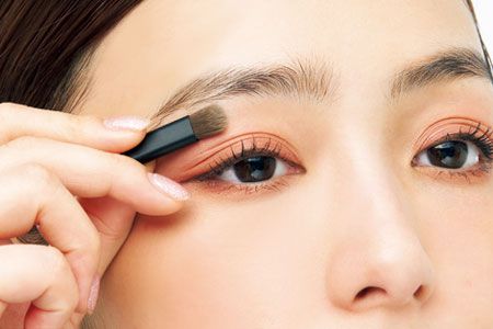 Dのアイシャドウの右上をアイホールにボカし、左下をまつ毛のキワからのせて、二重幅より少し広めまでボカして引き締め。