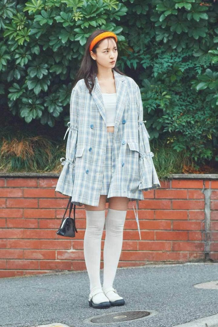 チェックジャケット 11,000円、チェックラップミニスカート 6,930円/ともにjouetie 白ビスチエ 4,950円/COCO DEAL(ココ ディール) カチューシャ 4,400円/キャセリーニ バッグ 34,452円/MARGESHERWOOD(MUSINSA GLOBAL STORE) ニーハイソックス 1,760円/靴下屋(Tabio) シューズ7,500円/オリエンタルトラフィック(ダブルエー)