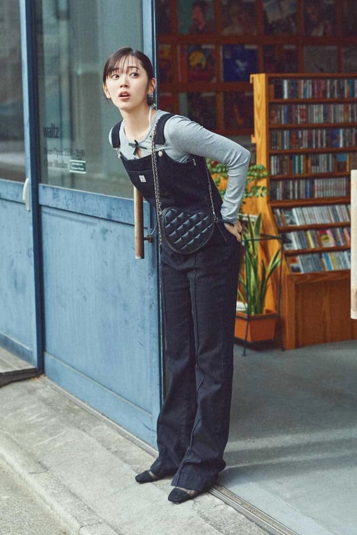 黒オーバーオール 29,267円/INSTANTFUNK(MUSINSA GLOBAL STORE) グレーリボンインナーつきニット 5,900円/MORE self LOVE バッグ 11,500円/チャールズ&キース(チャールズ&キース ジャパン) パンプス 6,590円/ZARA(ザラ)
