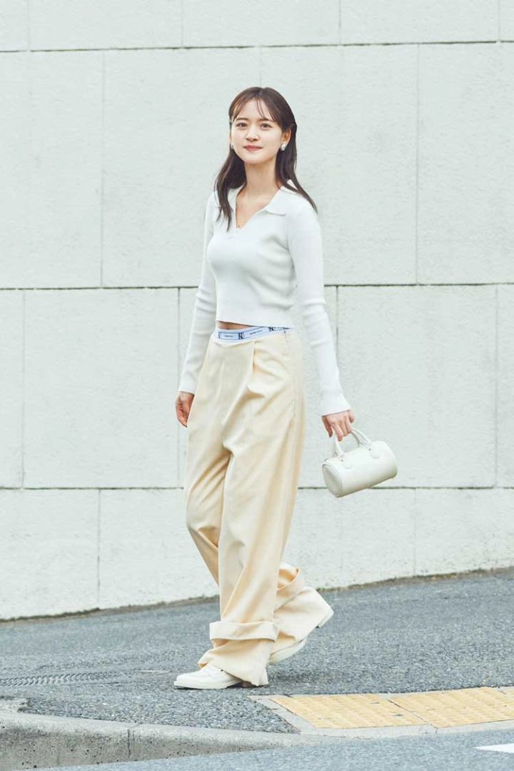 イエローロゴパンツ 13,480円/Katrin TOKYO 白ニット 5,990円/GYDA ルミネエスト新宿店 イヤリング 5,670円/アビステ バッグ 34,113円/MARGESHERWOOD(MUSINSA GLOBAL STORE) ローファー14,300円/STILMODA(ROSE BUD ルミネエスト新宿店)