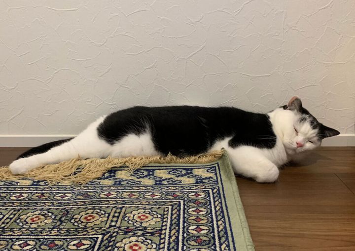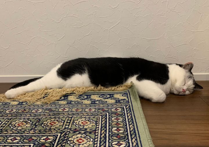 フローリングで遊び疲れて寝た俺。爆睡中。暑がりなのでホットカーペットは無視してるのさ〜。