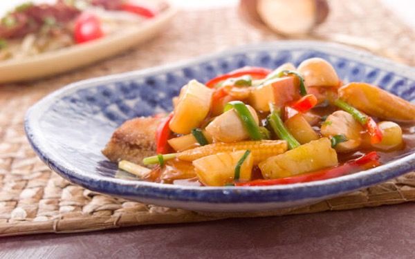 カリカリに揚げたアジに、野菜たっぷりの甘辛いあんをかける、彩り豊かなおかずです。あんにフルーツも入っているところが、エスニックらしい雰囲気ですね。本場ではパーティーなどの際に、高級魚のマナガツオを使って作られることが多いそう。