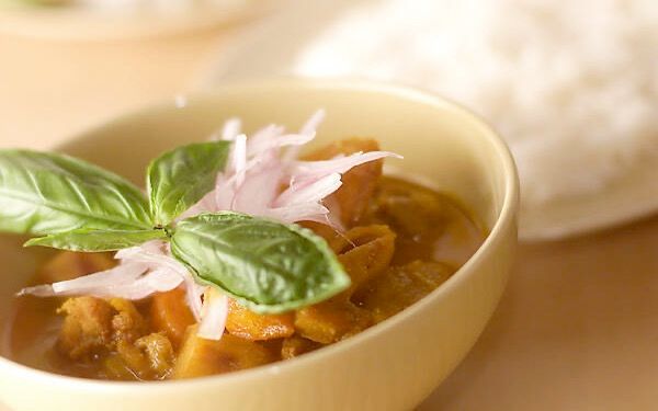 ベトナムのカレーの特徴は、ホクホクの甘いサツマイモが入っていること。ココナッツミルクとの相性も抜群です。さらに、レッドカレーペーストとカレー粉を合わせて使うので、タイカレーよりもマイルドでやさしい味わいになり、スパイスやハーブの香りを存分に楽しめます。