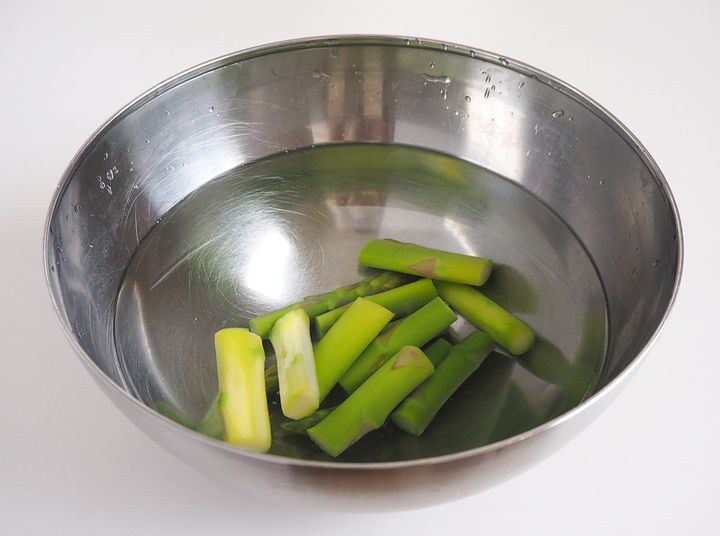 アスパラは茹でた後、冷水にさらすことで色止め効果があり、発色がよくなります。