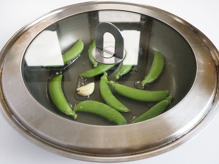 2. スナップえんどう(筋がついたまま)をフライパンに並べ、潰したにんにく、水大さじ2と塩少々(分量外)を加える。蓋をして中火にかけ、沸騰したら1分半加熱する。