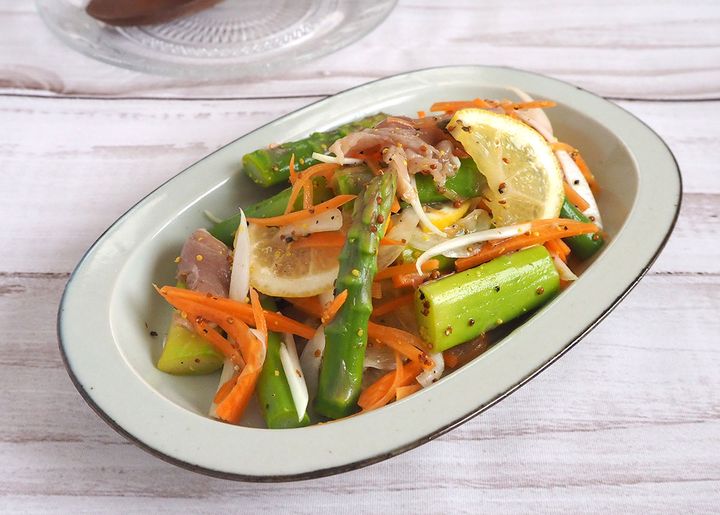 塩茹でしたアスパラと生ハム、レモンを酸味のあるマリネ液で和えています。