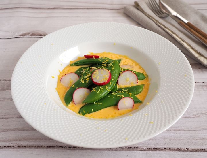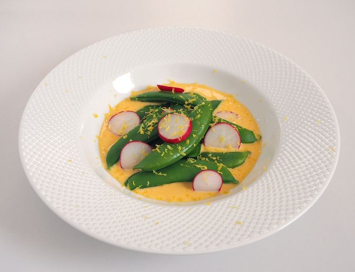 コクがありながらもレモンでさっぱりとした卵黄チーズソースに、にんにくと一緒に蒸したスナップえんどうを盛り付けました。