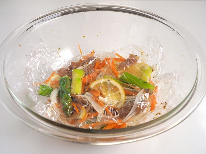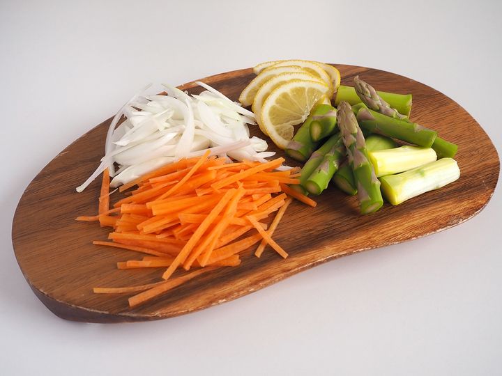 1. アスパラは下部を切り落とし、ピーラーで筋を取り除き、4等分に切る。新玉ねぎは薄切りにして空気にさらす。にんじんは皮を剥いて千切りに、レモンは銀杏切りにする。