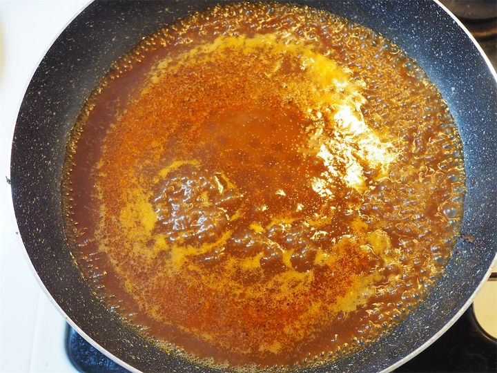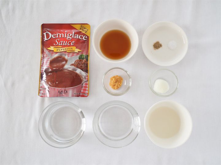 8.フライパンに残った肉汁に、市販のデミグラスソースと水、白ワイン、めんつゆを入れ煮立たせる。