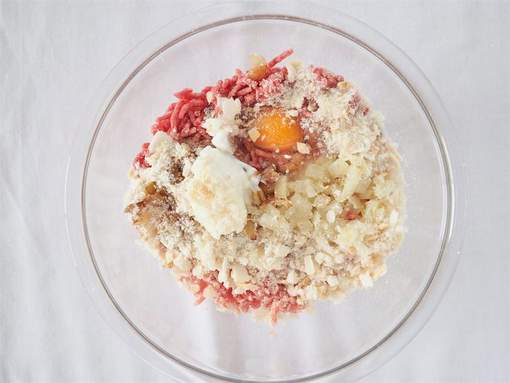 3.牛ひき肉、豚ひき肉、ヨーグルト、卵、ナツメグ、塩、こしょう、12を混ぜ、こねていく。