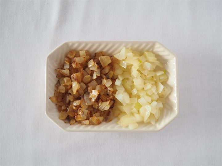 1.玉ねぎをみじん切りにし、炒める。2分経ったら半量取り出し、残りは飴色になるまで炒めていく。