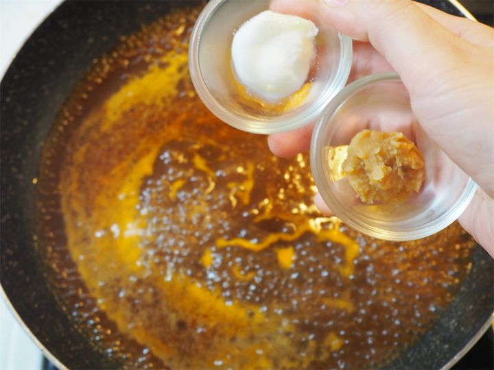 9.ヨーグルトとみそを入れ、かき混ぜながら加熱する。
