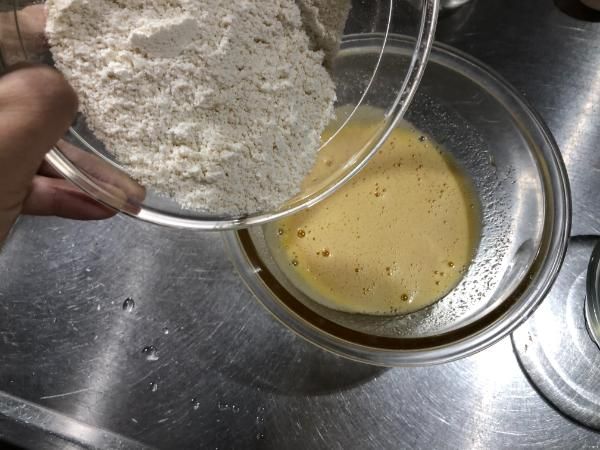 ③①の粉を②に加えて、粉っぽさがなくなる程度まで混ぜ、ラップをして冷蔵庫で30分程度寝かせる