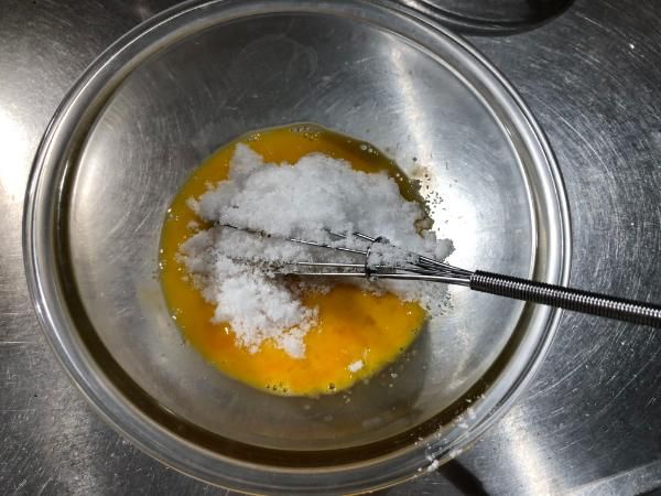 ②ボウルに卵を溶きほぐし砂糖を2~3回にわけて入れながら混ぜる