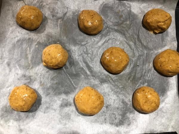④ピンポン玉くらいの大きさに丸めてクッキングシートを敷いた鉄板に並べる ※とても膨らむので鉄板1枚に8個ぐらいを目安に間隔をあけて焼くこと!