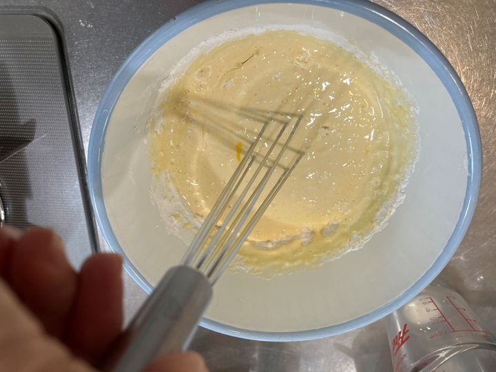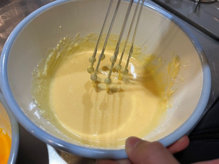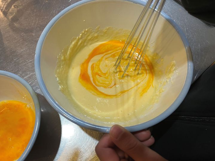 こちらはチーズケーキの生地づくり。クリームチーズと砂糖を混ぜたものに、溶き卵を加えて混ぜます。