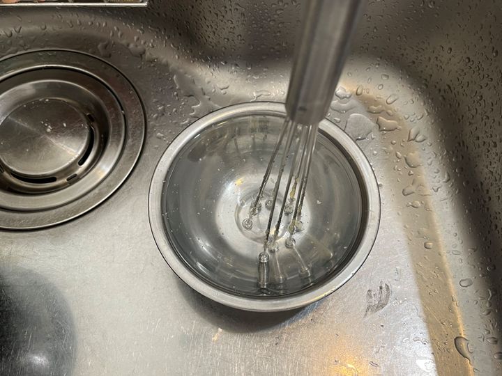 泡立て器に絡みついたものを洗うのはなかなか厄介ですが、この泡立て器は洗いやすさもポイントが高い! 先端を開いた状態で立てられるので、水を張ったボールに浸けて汚れをふやかすこともできます。