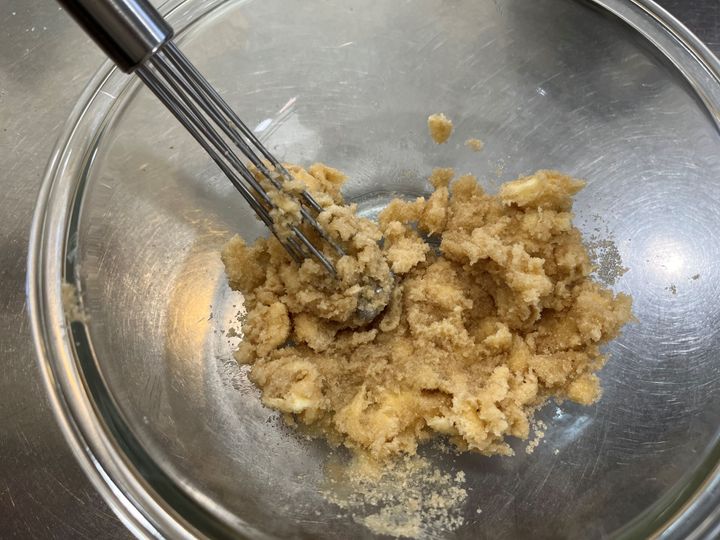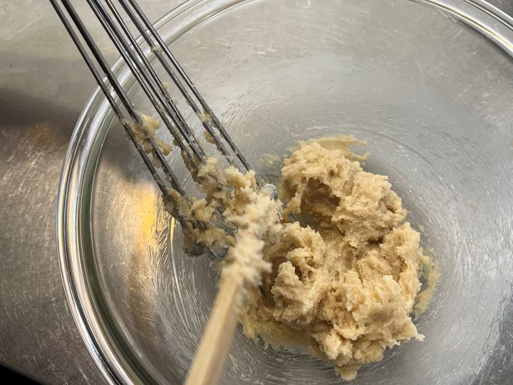 クッキー生地作りに欠かせない、バターと砂糖を練り混ぜる作業。これも普通の泡立て器だとバターが団子状になって中に入ってしまい、どんどんやりにくくなるのですが……この泡立て器なら先端のボールがしっかりバターをつぶしていきます。