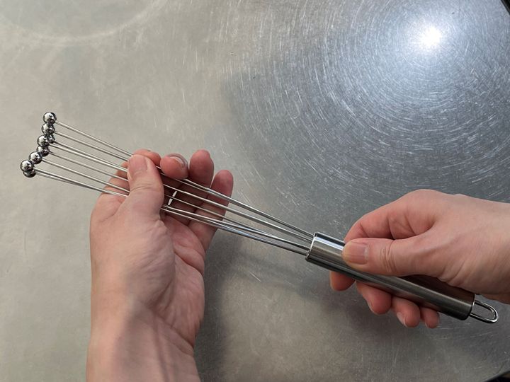 例えるなら茶せんのように、持ち手から伸びた8本のステンレスの棒の先端にボールが付いています。使うときは、こうやって持ち手から引っ張ると……