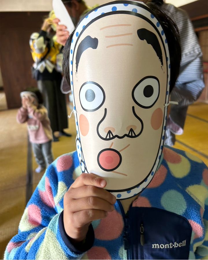 【お面を付けて、さぁ、みんなでひょっとこ♪】
