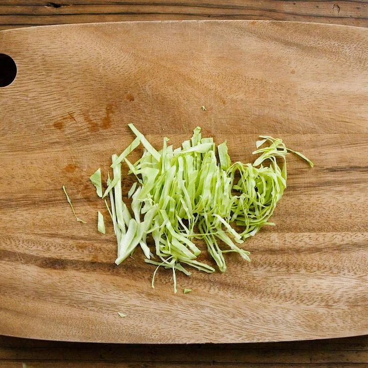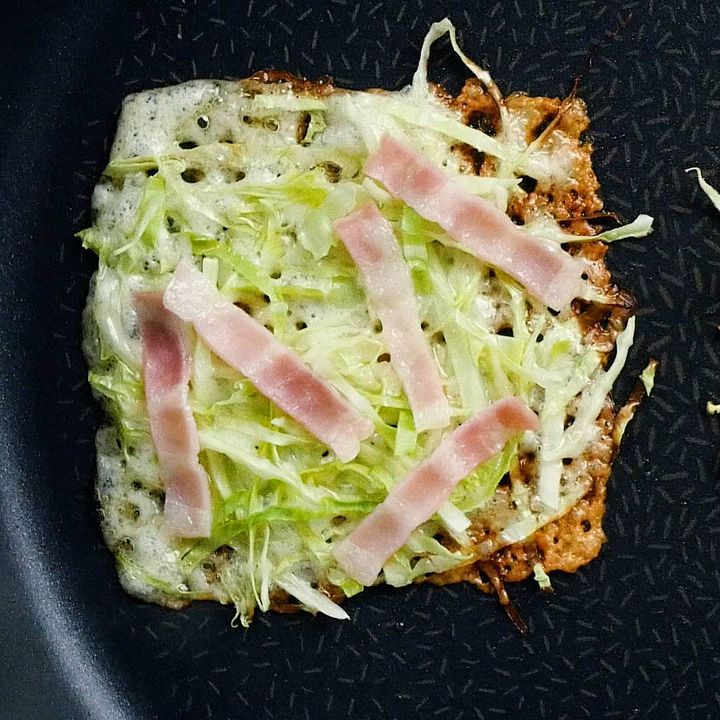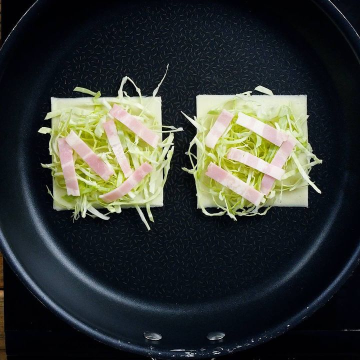 2: フライパンにとろけるチーズをのせ、その上にキャベツ、ベーコンをのせます。