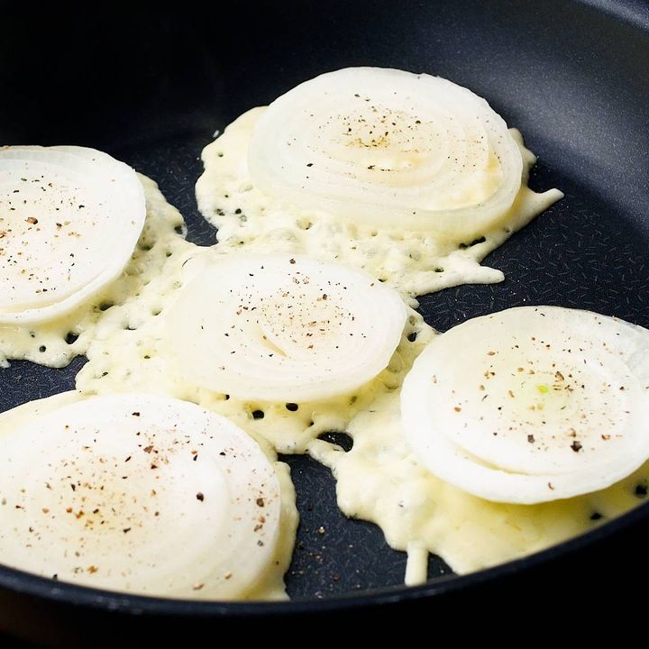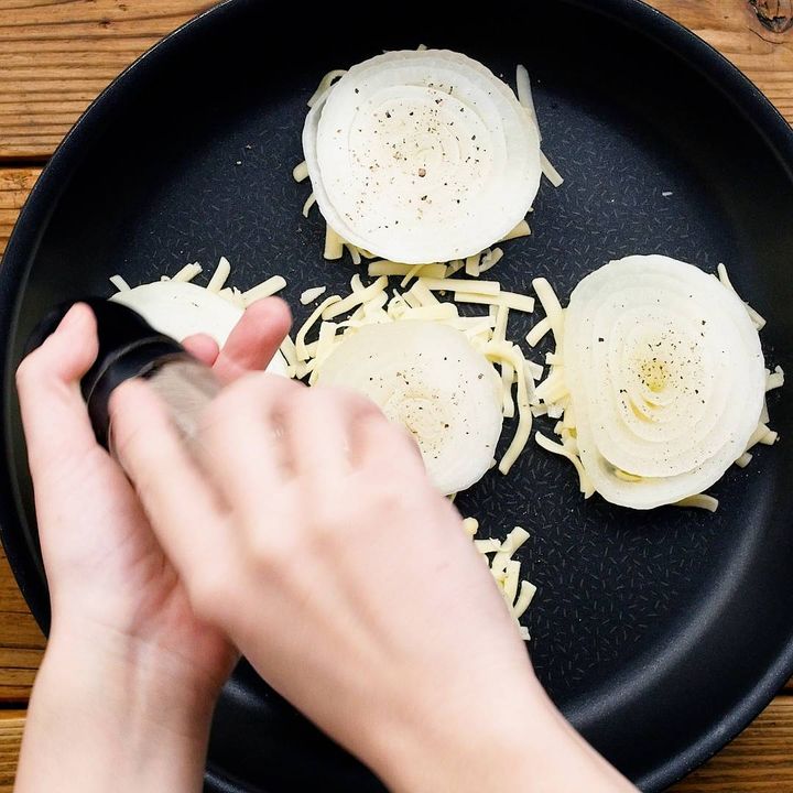 2: フライパンにとろけるチーズを5カ所に分けて置き、①の新玉ねぎをのせます。塩、黒こしょうをかけます。
