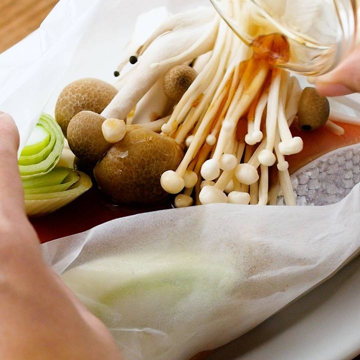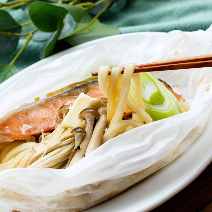 1: クッキングシートに凍ったままのうどん、鮭、しめじ、えのき、長ねぎをのせます。