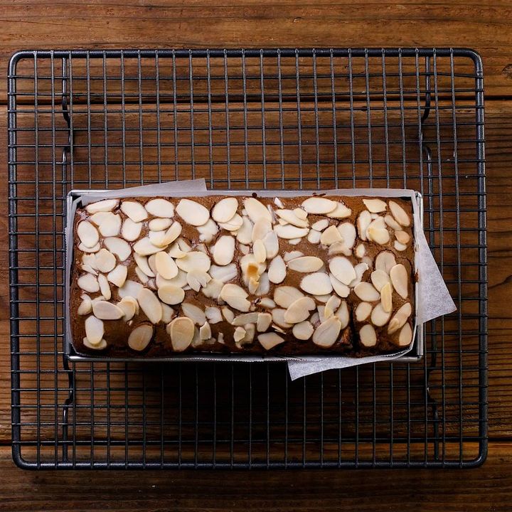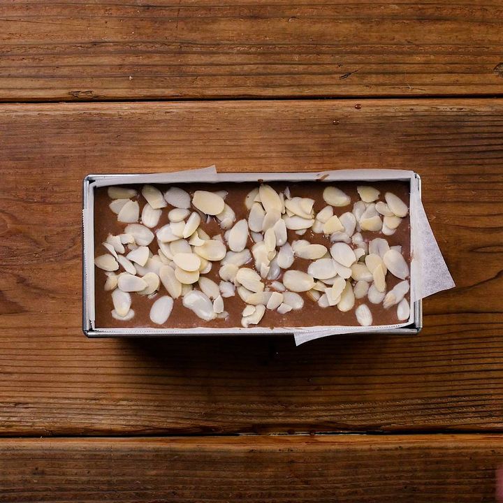 5: アーモンドスライスをのせ、170℃に予熱したオーブンで50分焼きます。