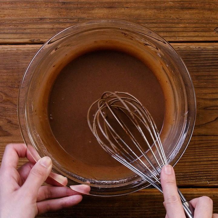 2: 溶かしバターを加えて混ぜたら、薄力粉をふるい入れ、粉気がなくなるまで混ぜます。