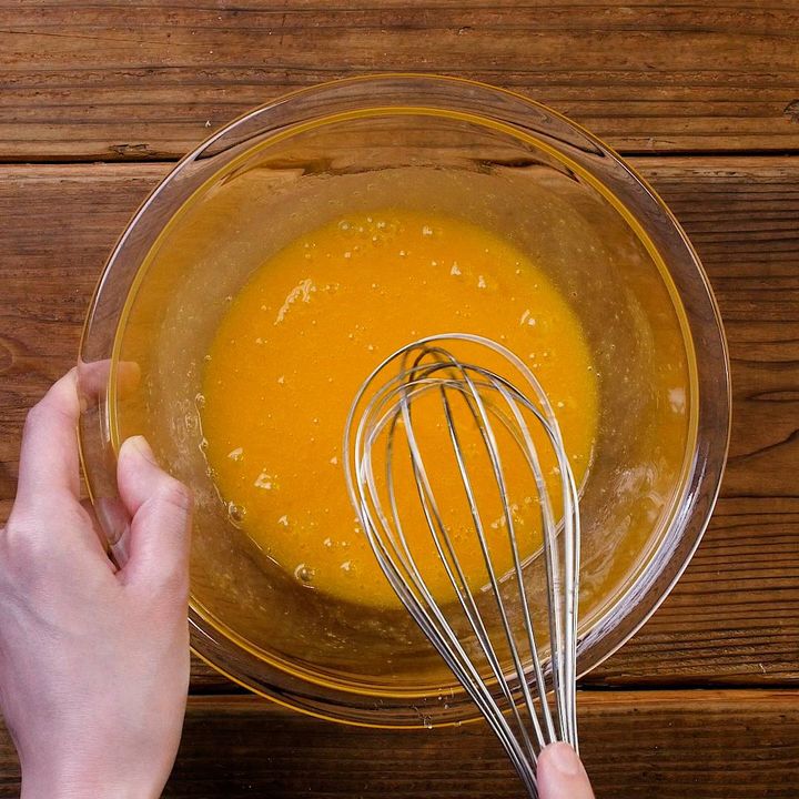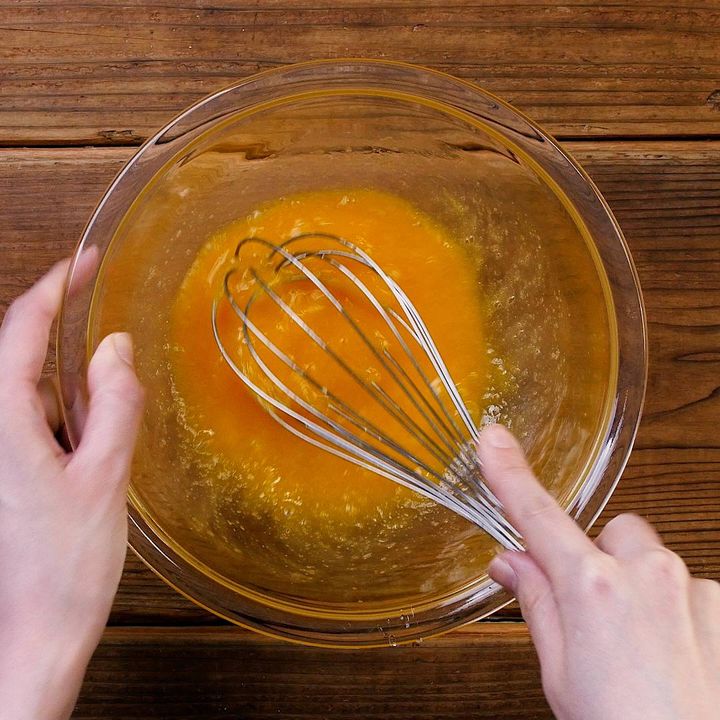 1: ボウルに卵、グラニュー糖を入れて混ぜます。