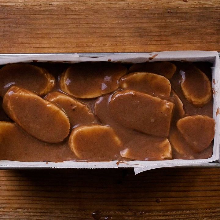4: クッキングシートを敷いた型にバナナを重ねて入れ、残りの生地を流し込みます。