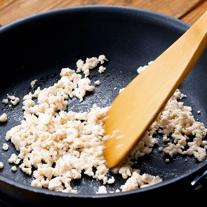 鶏ひき肉は弱火で潰しながら炒めることで、きれいなそぼろ状に仕上がります。
