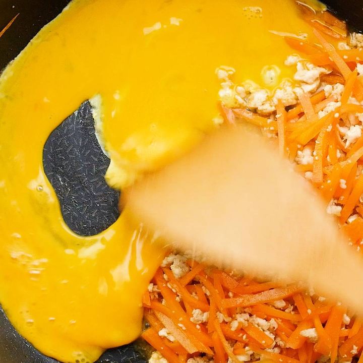 4: 卵を溶いて加え、全体に絡ませながら炒めます。
