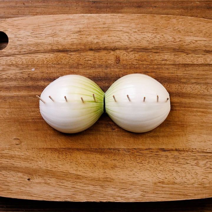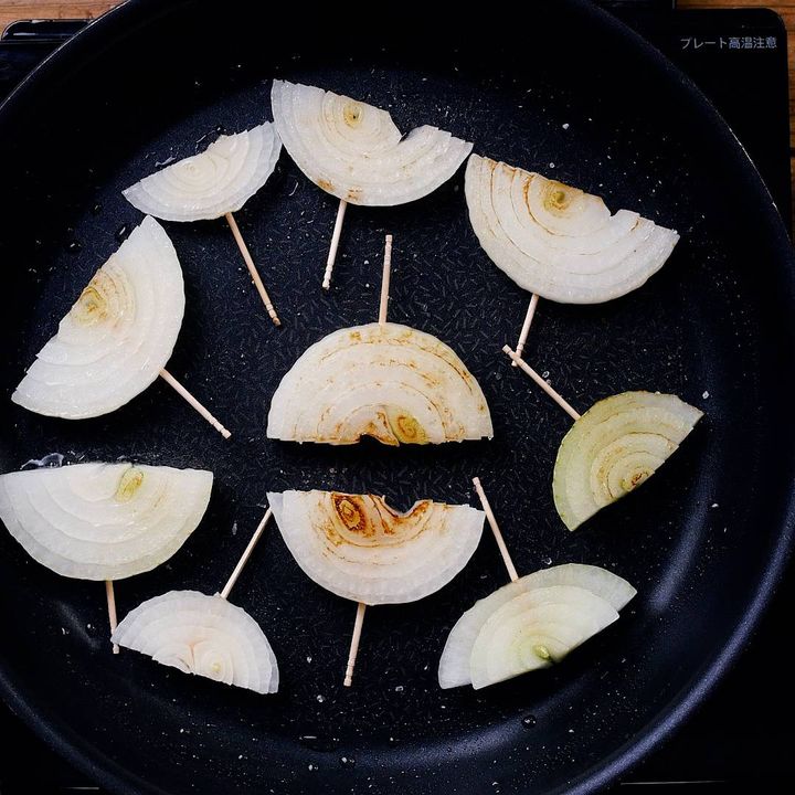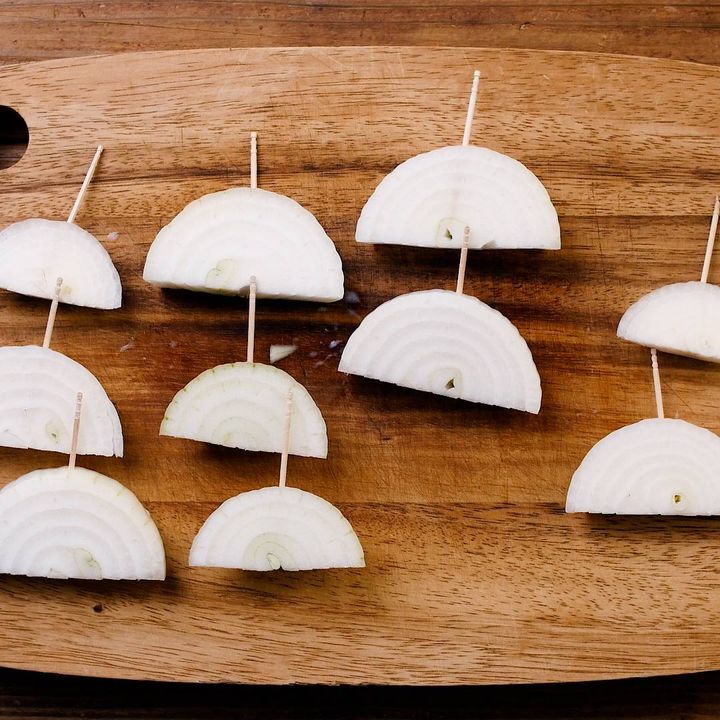 1: 玉ねぎは皮をむいて縦半分に切ります。爪楊枝を10本刺します。