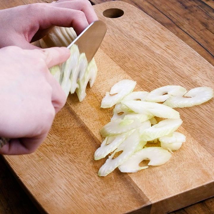 1: セロリは筋を取り、5mm幅の斜め薄切りにします。
