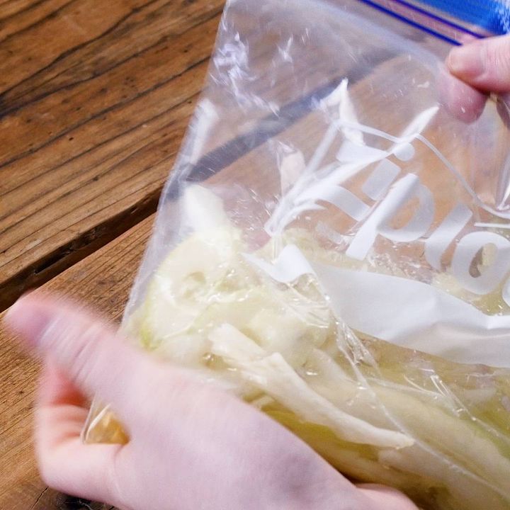 2: チャック付きのポリ袋に入れ、 (a) を加えてよく揉み込み、冷蔵庫で15分なじませます。