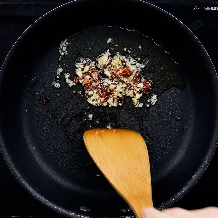 3: フライパンにオリーブオイルを引き弱火で熱し、にんにく、輪切り唐辛子を入れて弱火で加熱します。