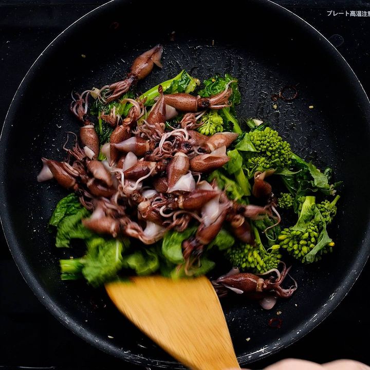 5: 菜の花の葉のとホタルイカを加えてさっと炒めます。